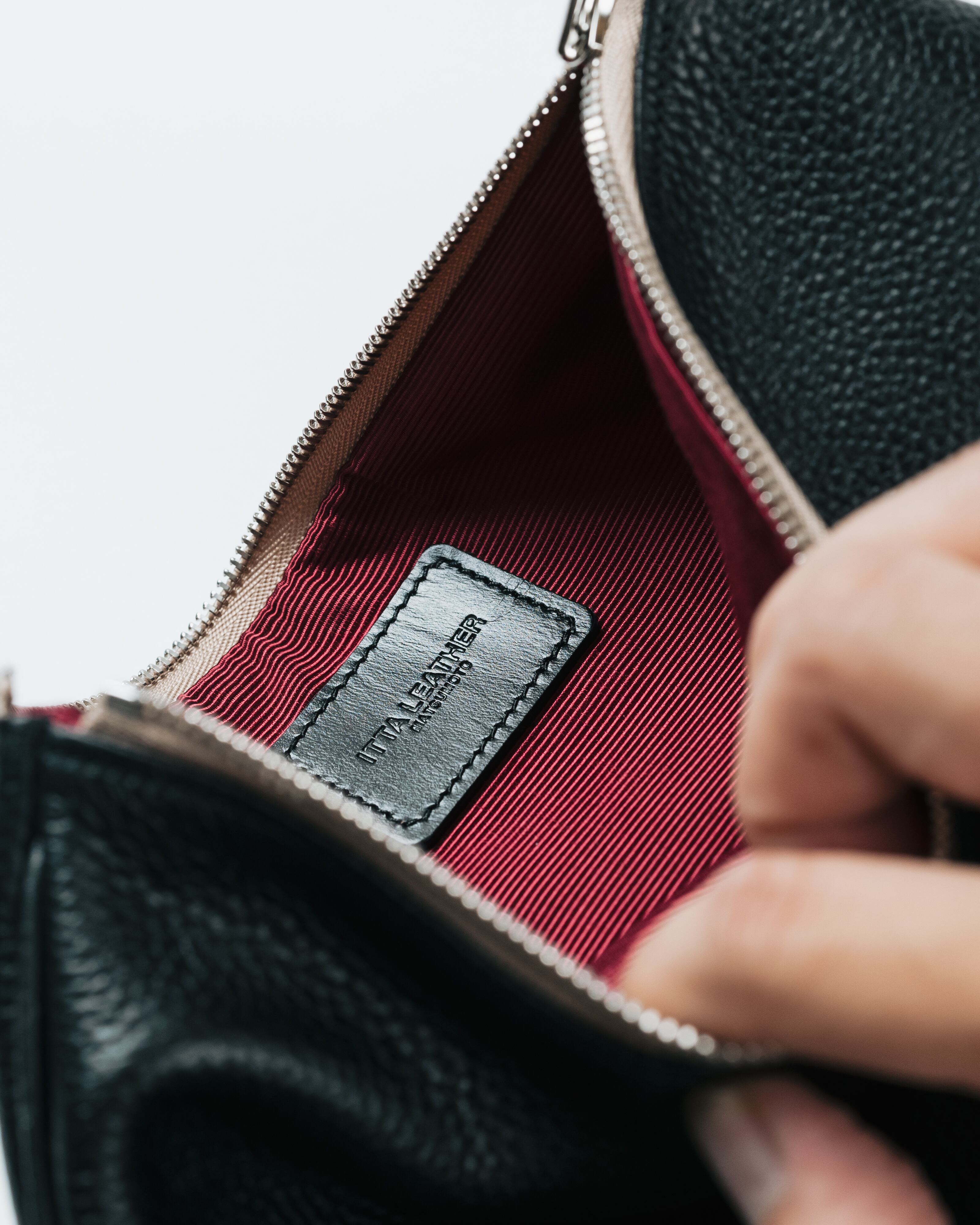 内装にシャンタンを貼り、レザーポーチによくある